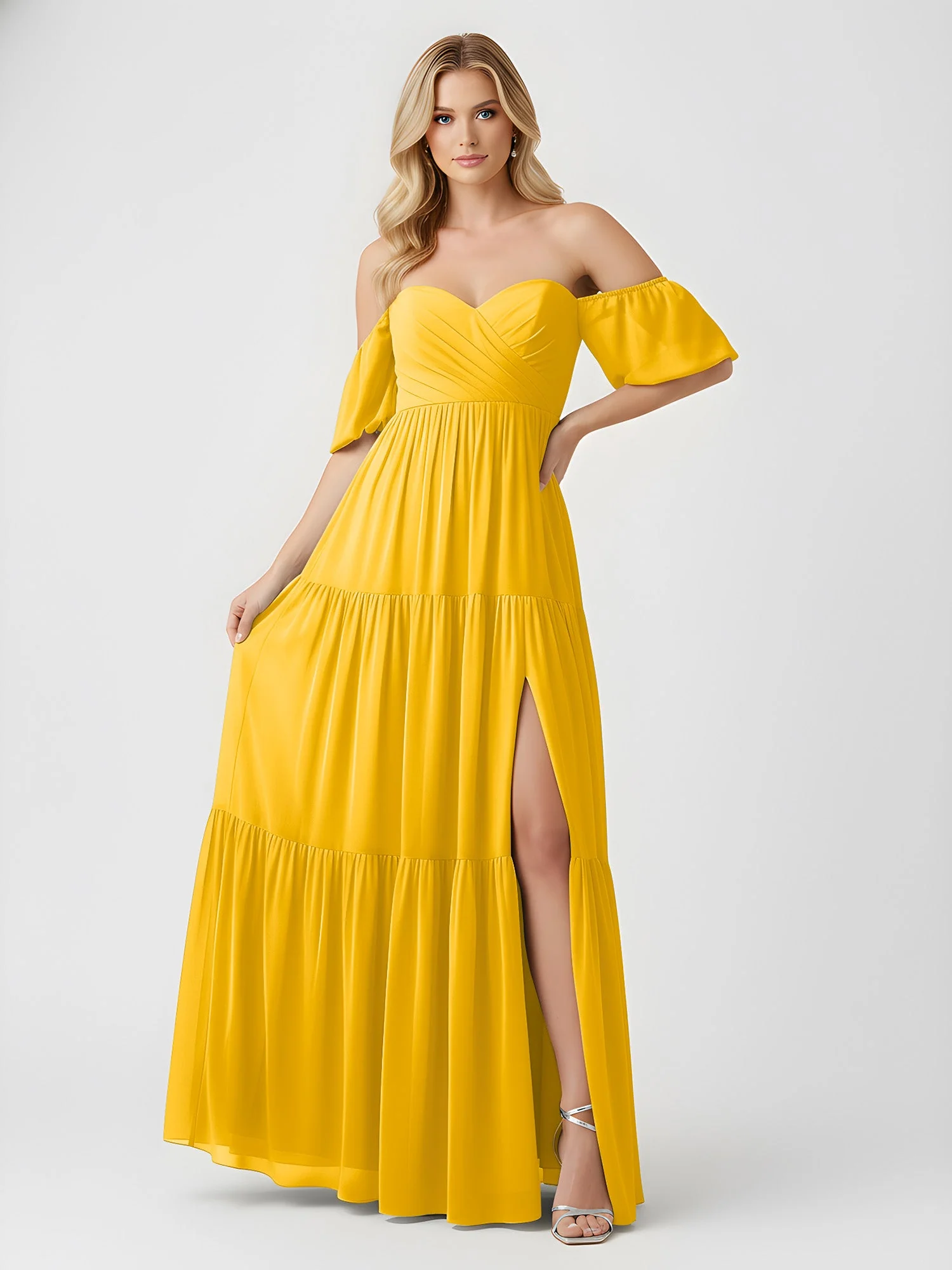 Schulterfrei Stufen Chiffon Maxi Kleid mit Schlitz Ringelblume