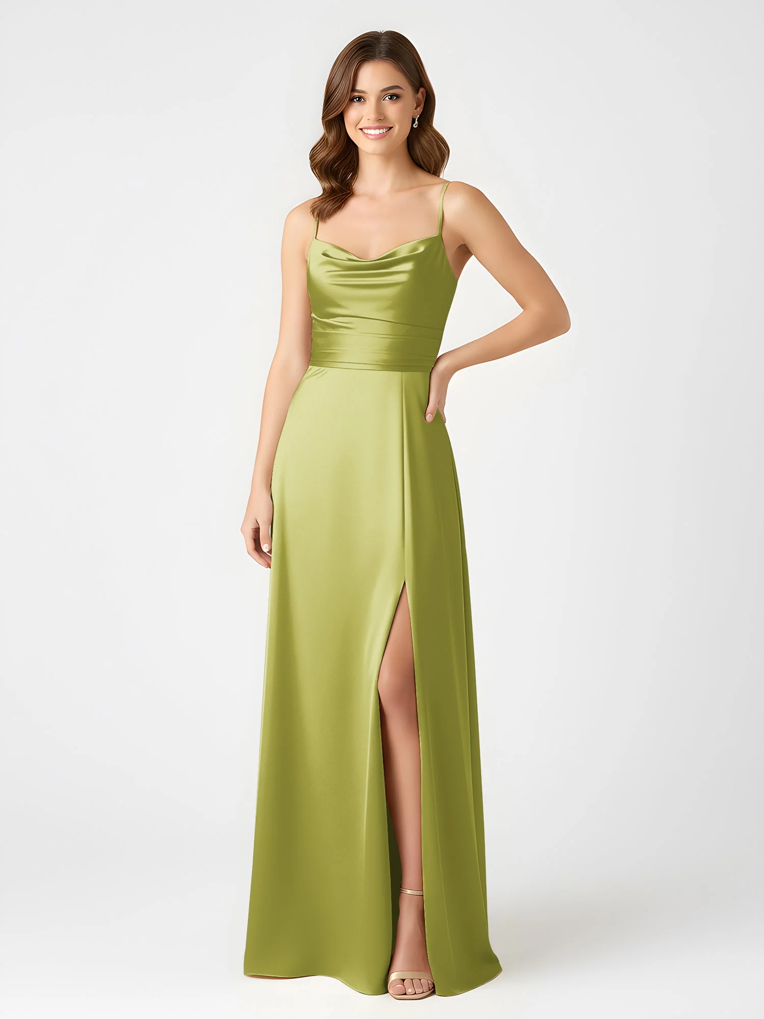 Cowl Ausschnitt Spaghettiträger Satin Kleid mit Schlitz Kleegrün