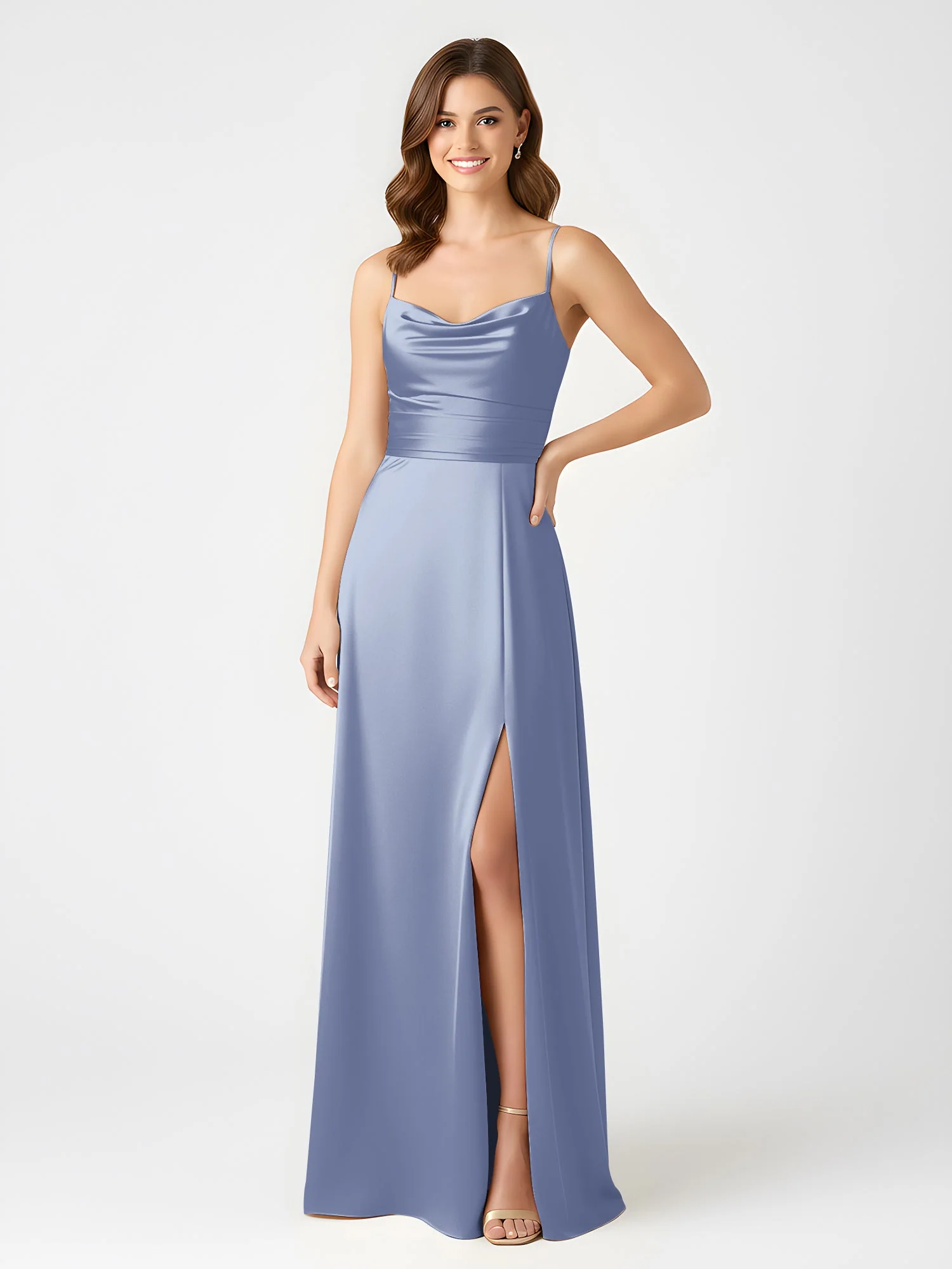 Cowl Ausschnitt Spaghettiträger Satin Kleid mit Schlitz Staubiges Blau