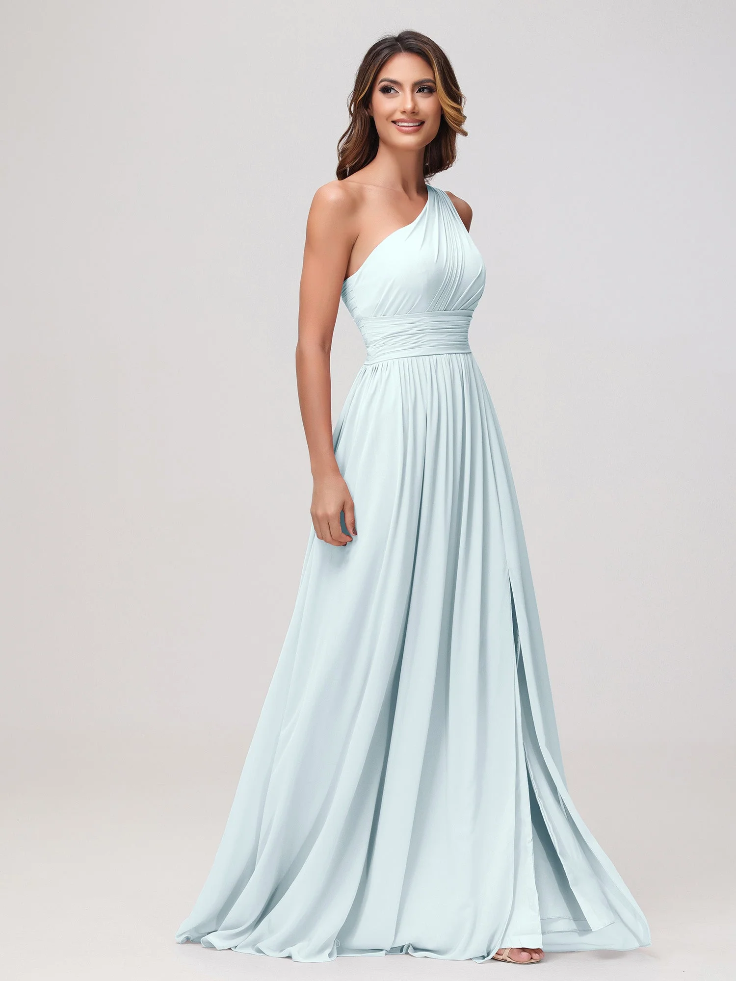 - Dieses Eine-Schulter ärmellose Chiffon-A-Linie-Kleid ist die perfekte Mischung aus Eleganz und Stil. Gefertigt aus leichtem Chiffon, fließt es wunderschön und unterstreicht Ihre anmutige Silhouette. Der bodenlange Saum sorgt für einen Hauch von Romantik und Raffinesse und ist ideal für jeden formellen Anlass.