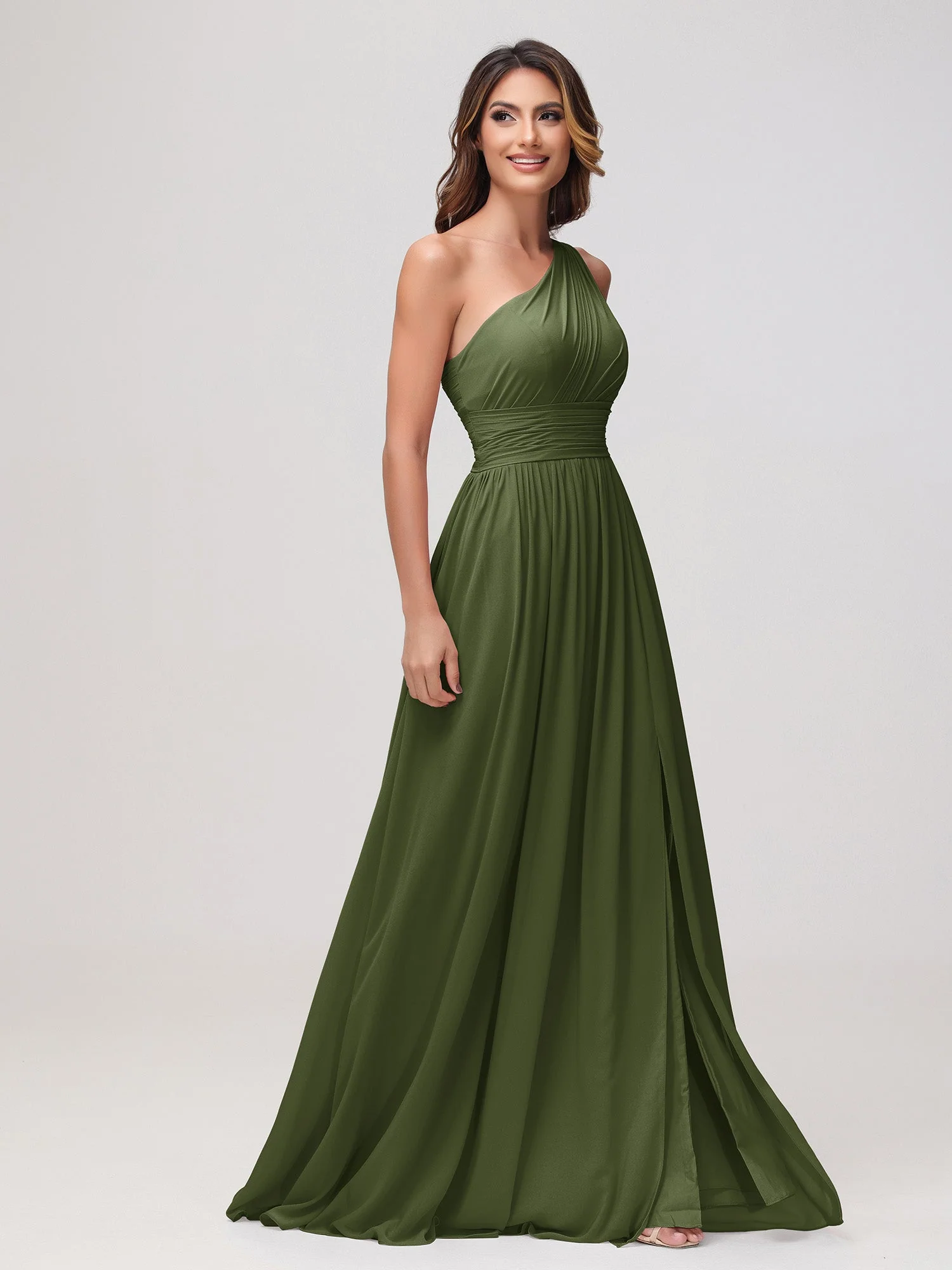 Eine Schulter Ärmellos Rüschen Chiffon A-Linie Kleid Olivgrün