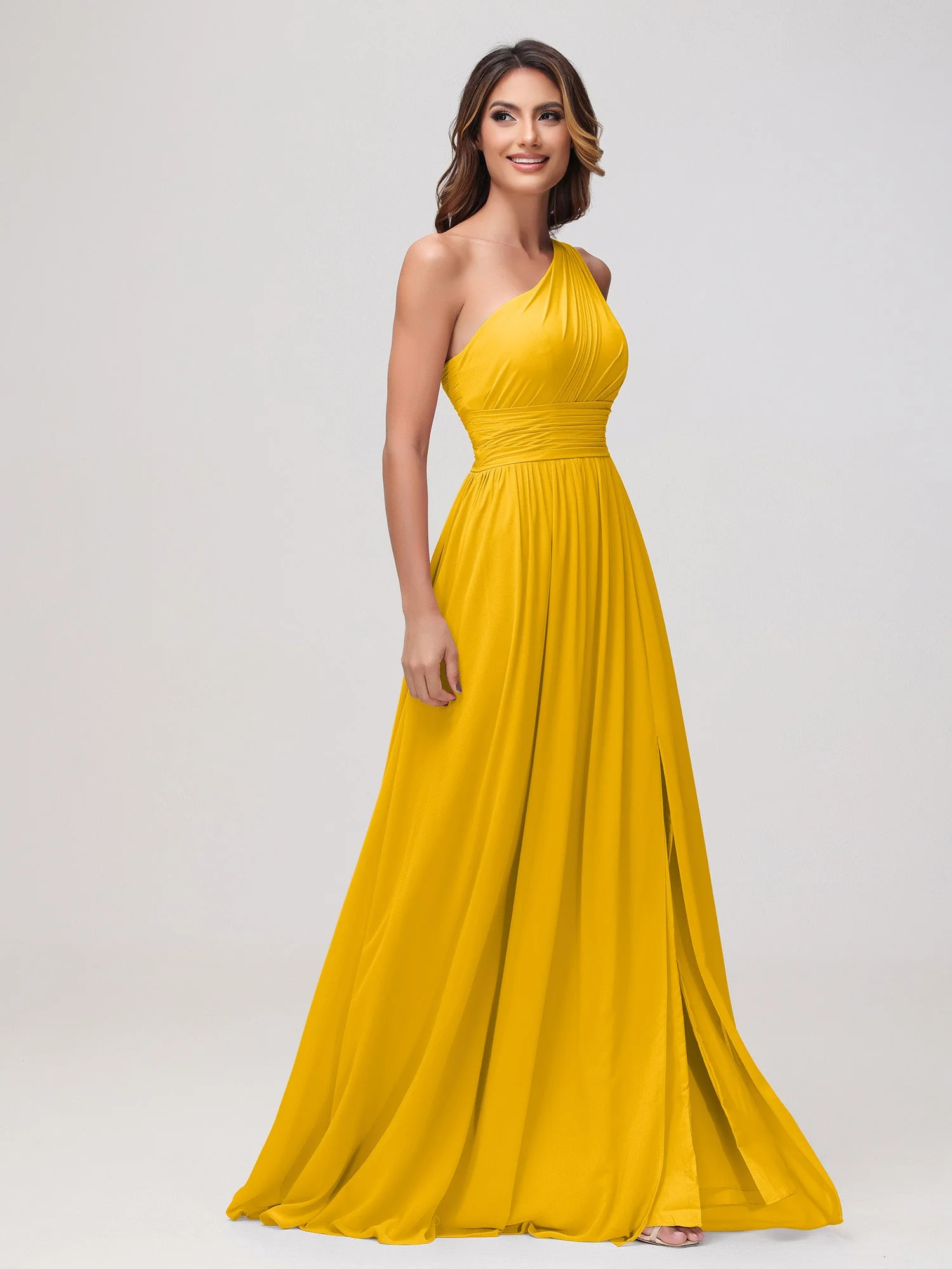 Eine Schulter Ärmellos Rüschen Chiffon A-Linie Kleid Ringelblume