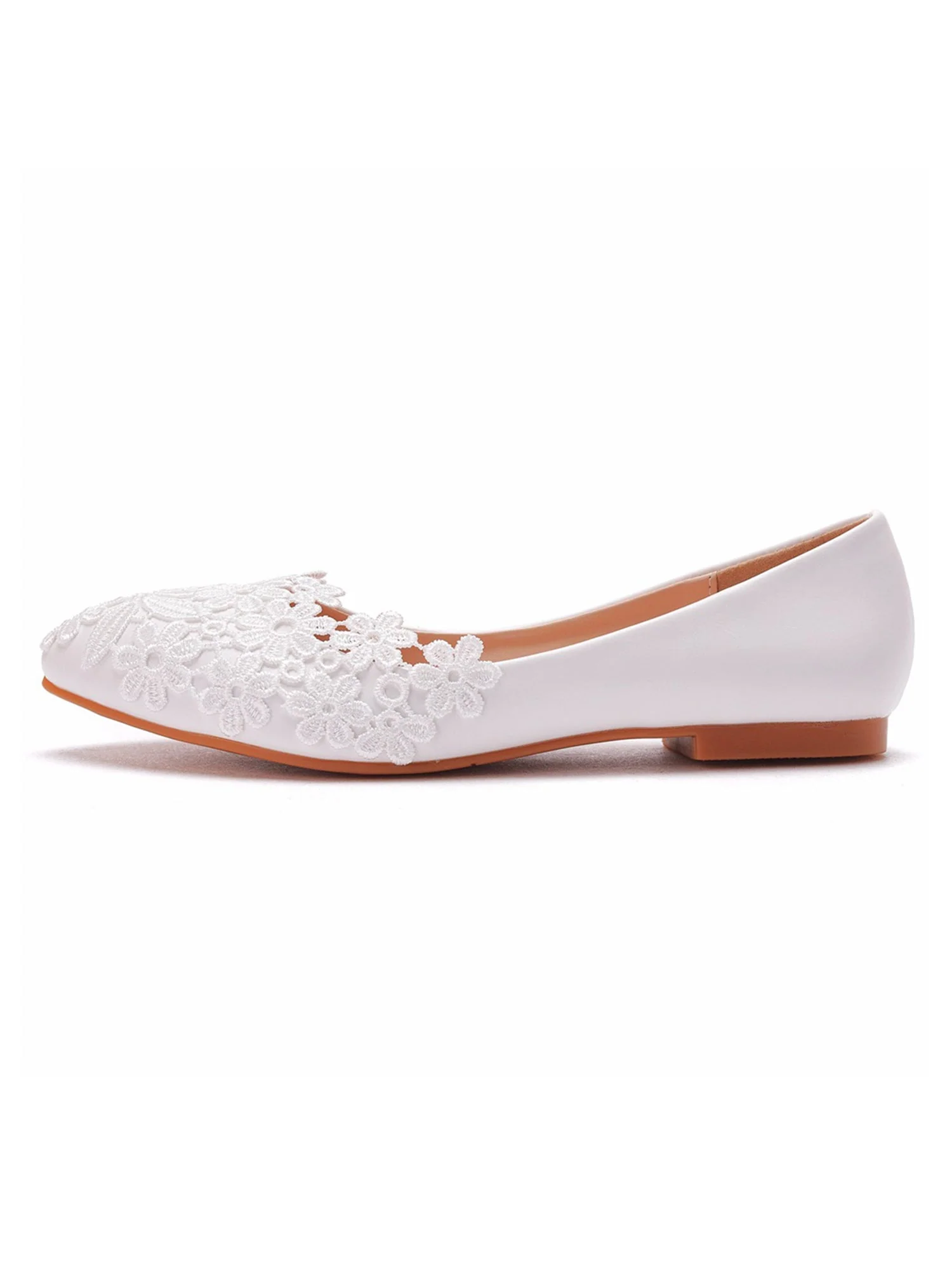 Diese flachen Hochzeits-Ballerinas mit Spitze und spitzer Spitze haben ein elegantes Spitzendesign im Slip-On-Stil. Der flache Absatz sorgt für Komfort, während das Obermaterial aus Kunstleder und Spitze einen Hauch von Braut-Eleganz verleiht. Perfekt für einen stilvollen und bequemen Hochzeitslook.