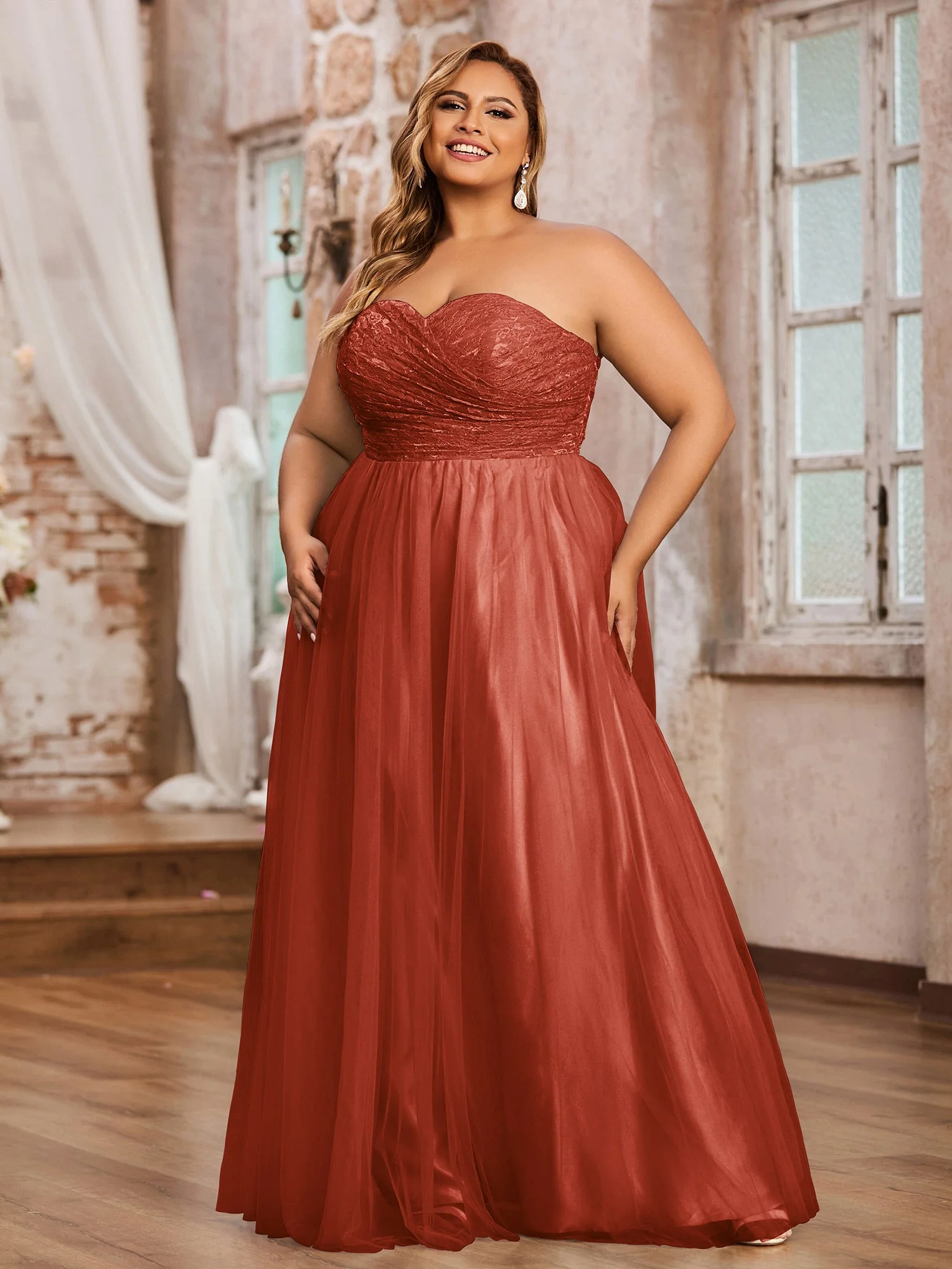 Spitze und Tüll Lang Kleid mit Herz-Ausschnitt Rost