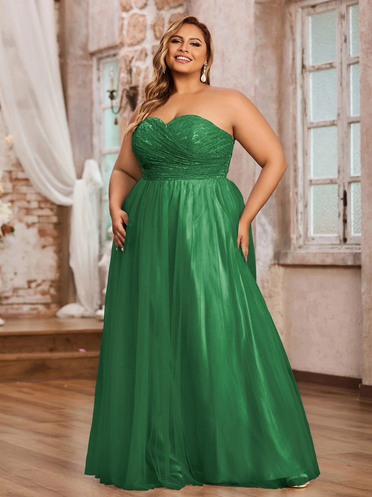 Spitze und Tüll Lang Kleid mit Herz-Ausschnitt Smaragd