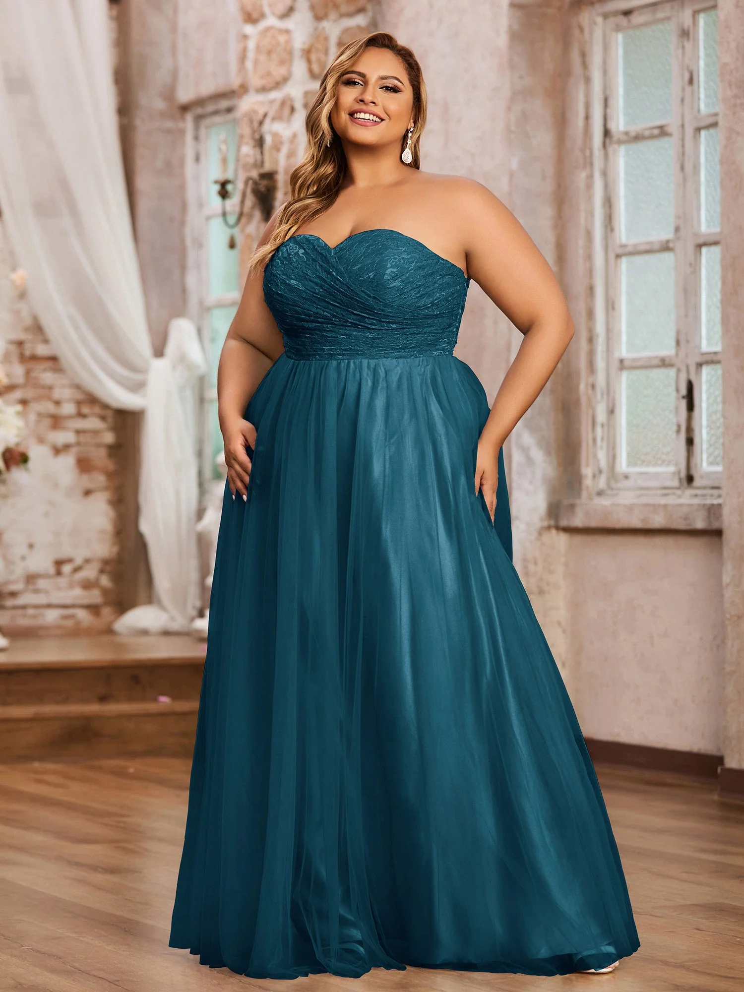 Spitze und Tüll Lang Kleid mit Herz-Ausschnitt Tinte Blau