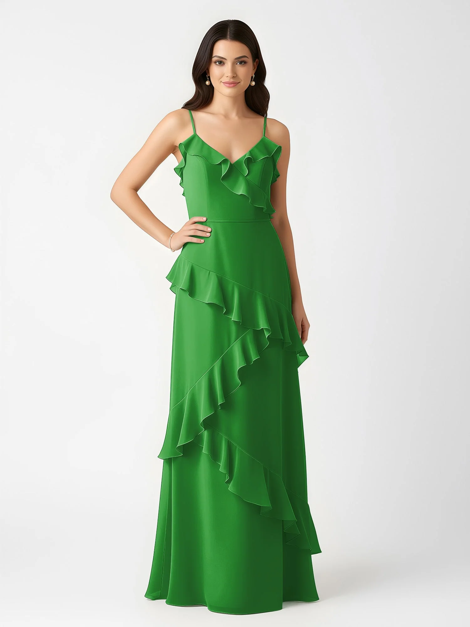 - Dieses Spaghettiträger-Kleid verfügt über einen V-Ausschnitt, der von Rüschen eingerahmt ist, mit kaskadierenden Schichten Rüschen, die die Seiten des bodenlängen Rock verfolgen. Der fließende Stoff fügt weiche Bewegung hinzu und verbindet romantischen Charme mit müheloser Eleganz - ideal für alle formelle Anlässe.
