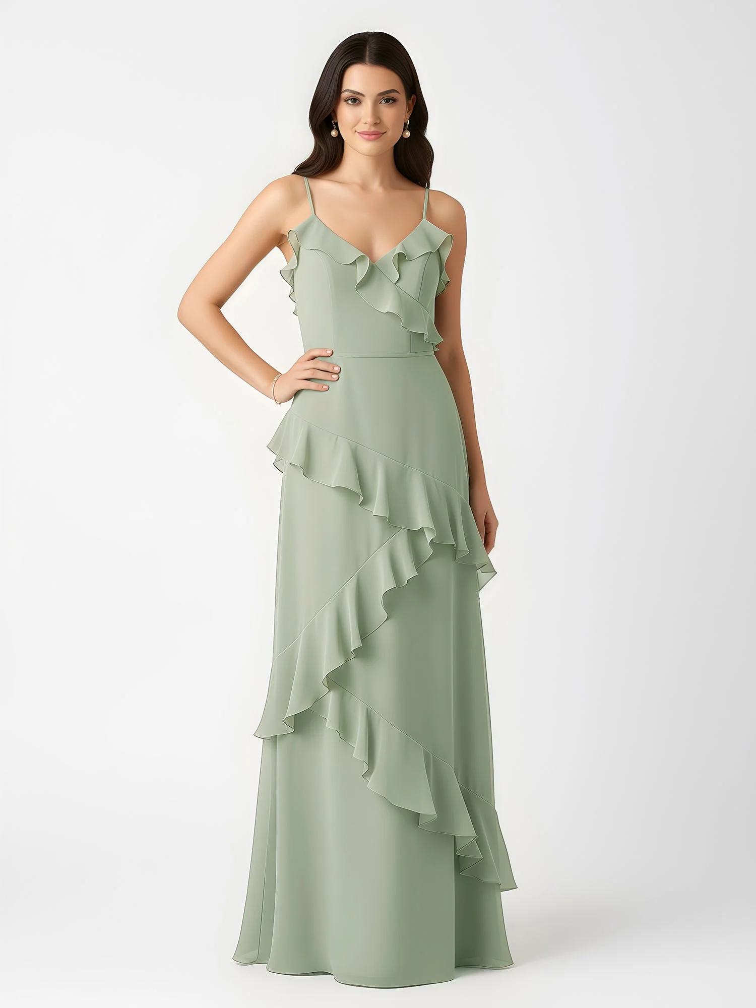 A-Linie Chiffon Rüschen Bodenlang V-Ausschnitt Kleid Staubiges Salbei