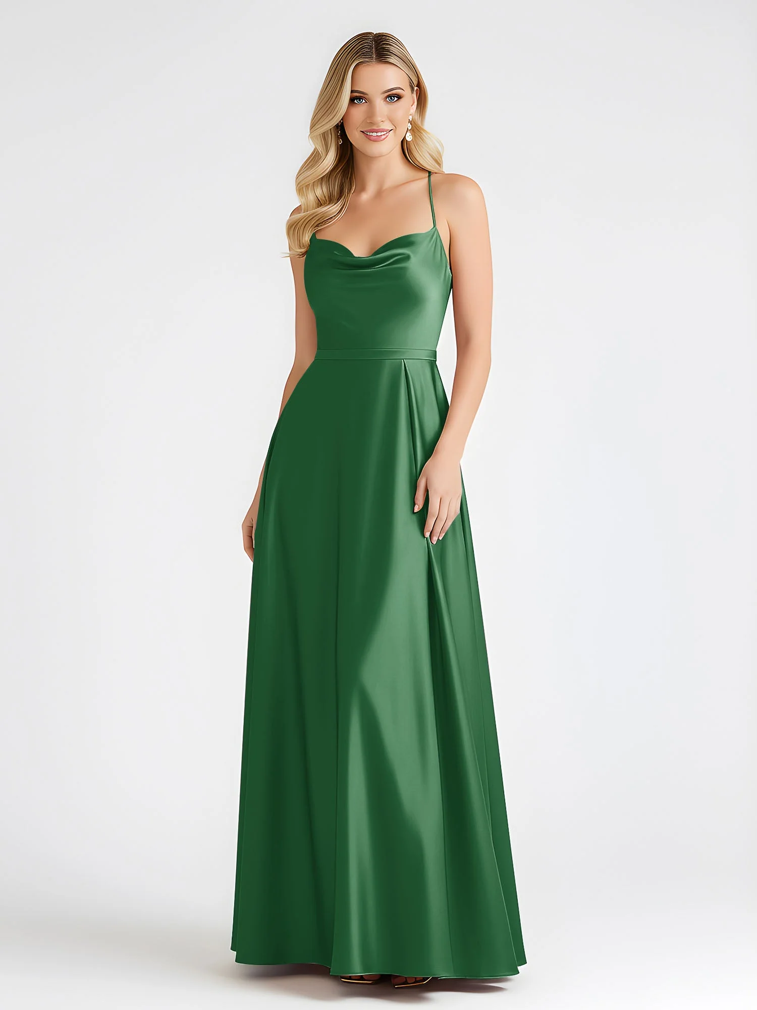 A-Linie Satin Bodenlang Cowl Ausschnitt Gerafft Kleid Smaragd