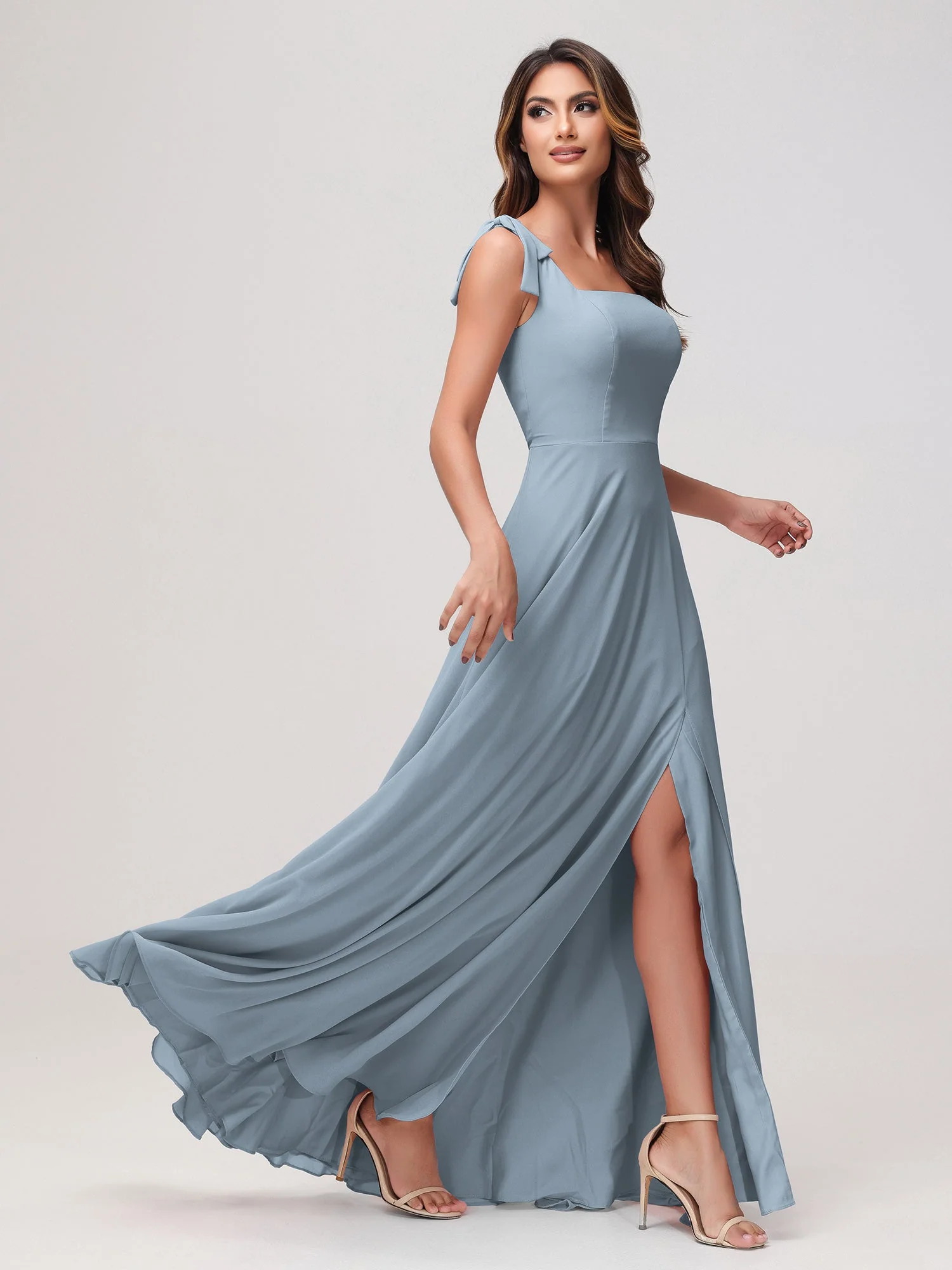 Quadratischer Ausschnitt Ärmellos Bodenlang Chiffon Kleid Staubiges Blau