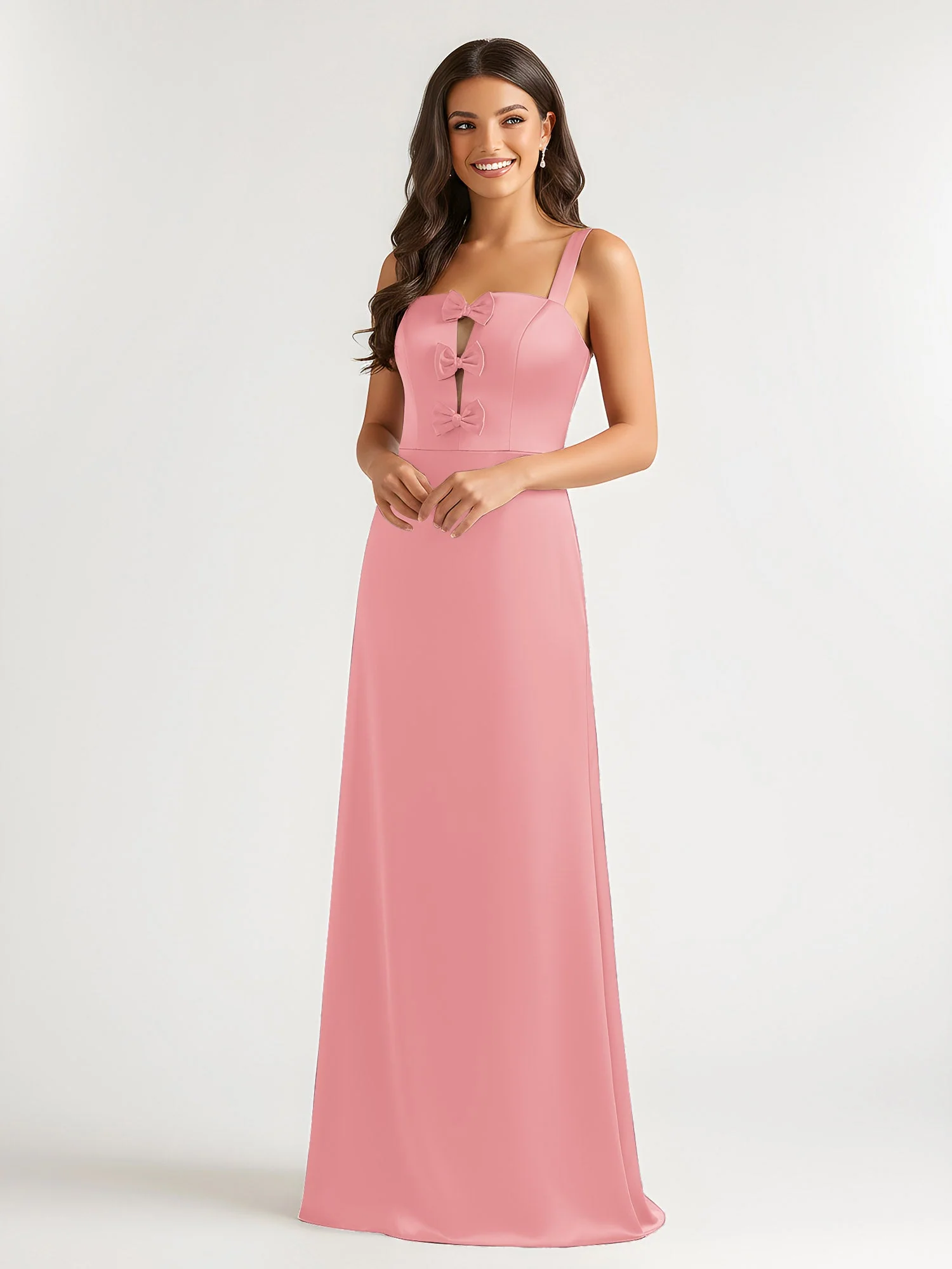 - Dieses Kleid hat einen quadratischen Ausschnitt mit Bogen Akzente auf dem Körper, gepaart mit einem bodenlängen Rock aus glänzendem Stoff. Der offene Rücken verleiht Eleganz, während das glatte Material weiche Bewegung schafft. Es verbindet spielerischen Charme mit Raffinesse, perfekt für formelle Veranstaltungen.