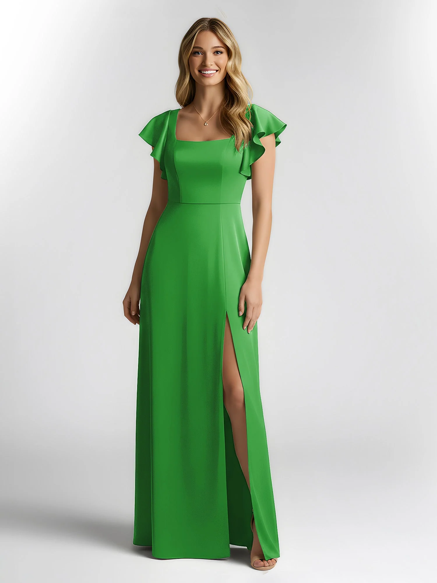 - Dieses Kleid verfügt über einen quadratischen Ausschnitt mit Flatterärmeln, gepaart mit einer a-Linie Silhouette und einem hohen Schlitz für Bewegung. Der glatte Stoff und der offene Rücken balancieren eine elegante Struktur mit subtiler Attraktivität. Ideal für formelle Versammlungen oder zum Besuch einer Hochzeit.