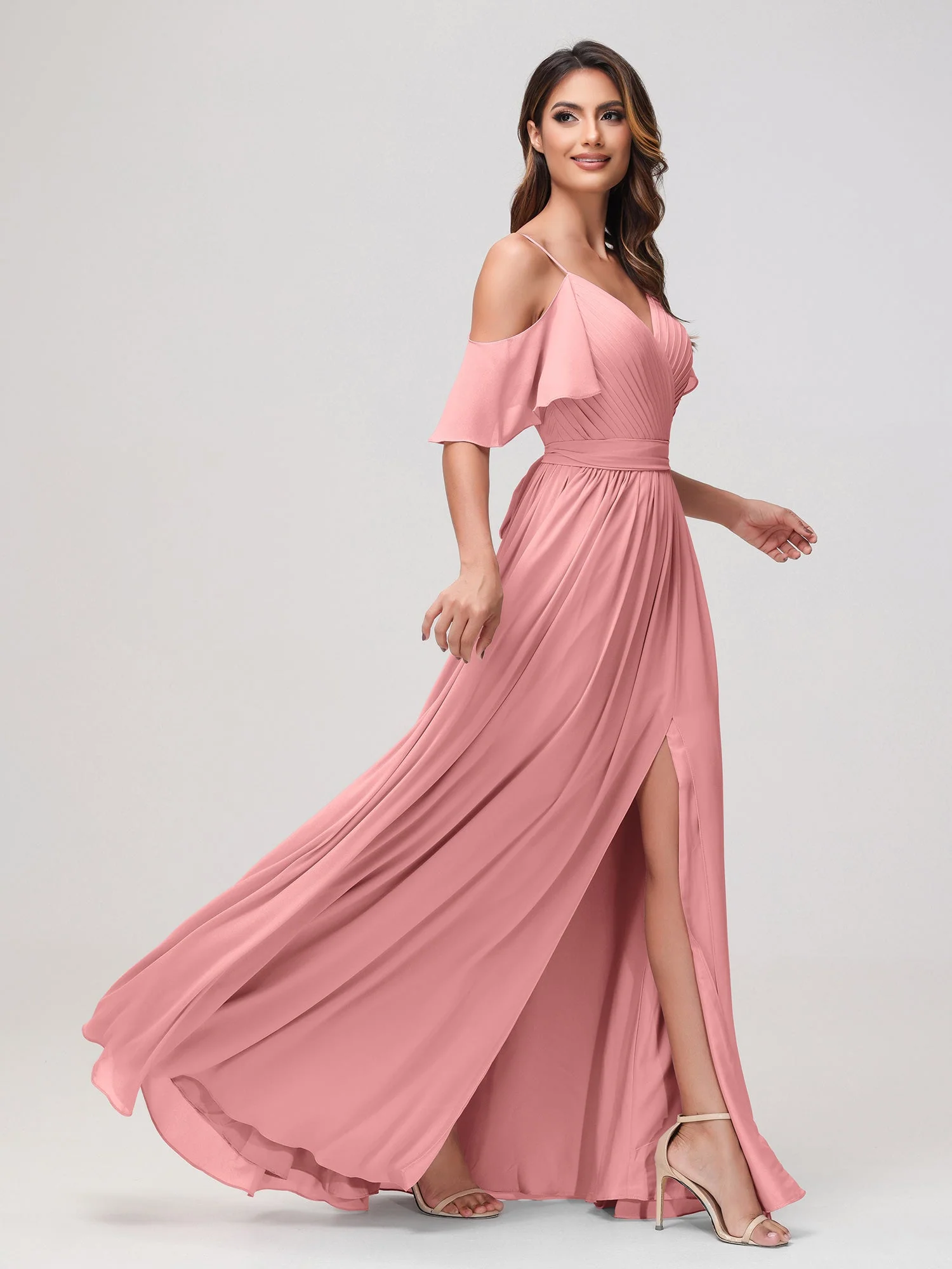 Schulterfrei A-Linie Rüschen Chiffon Kleid mit Schlitz Flamingo