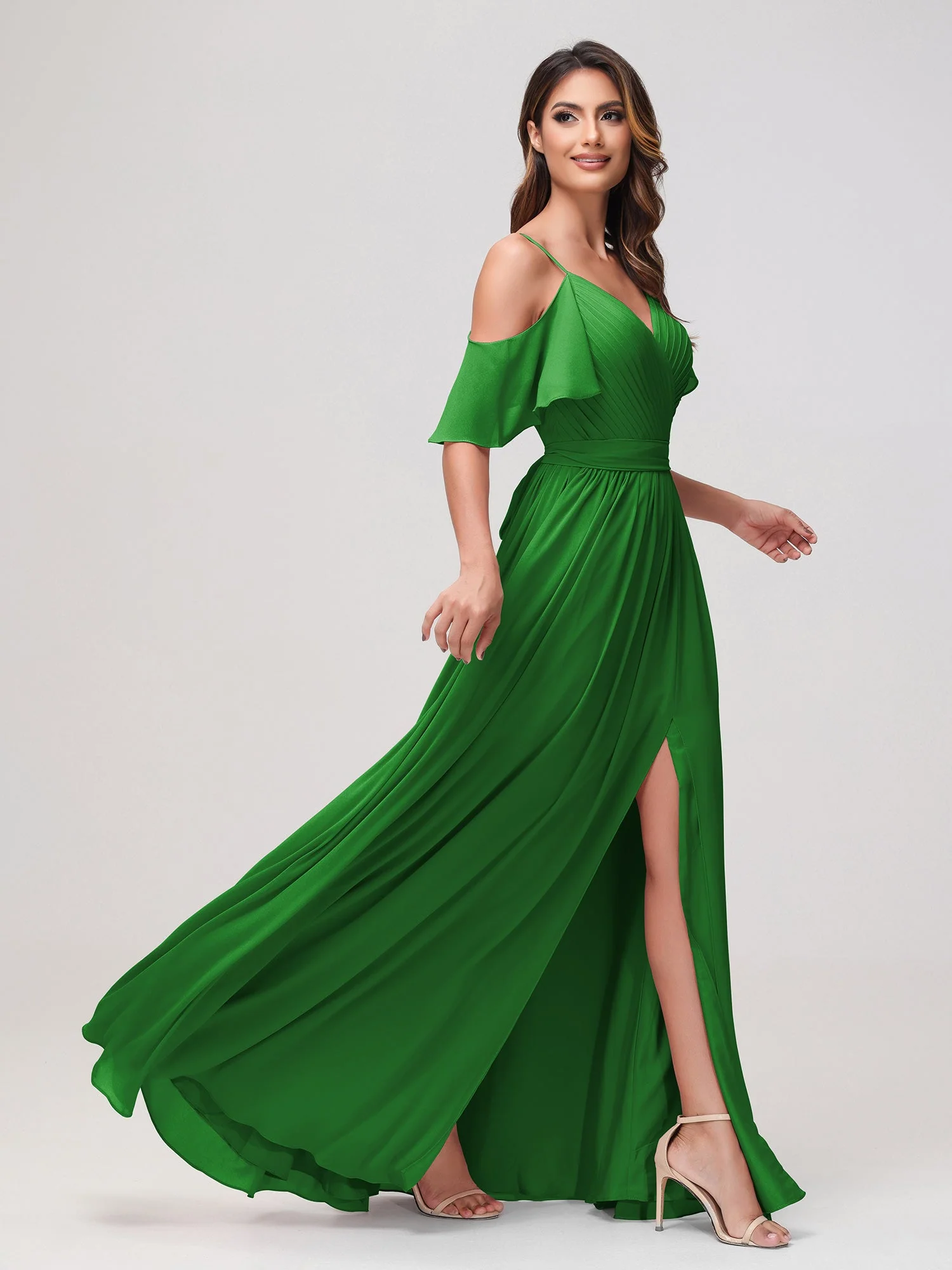 -70%Schulterfrei A-Linie Rüschen Chiffon Kleid mit Schlitz Grün—