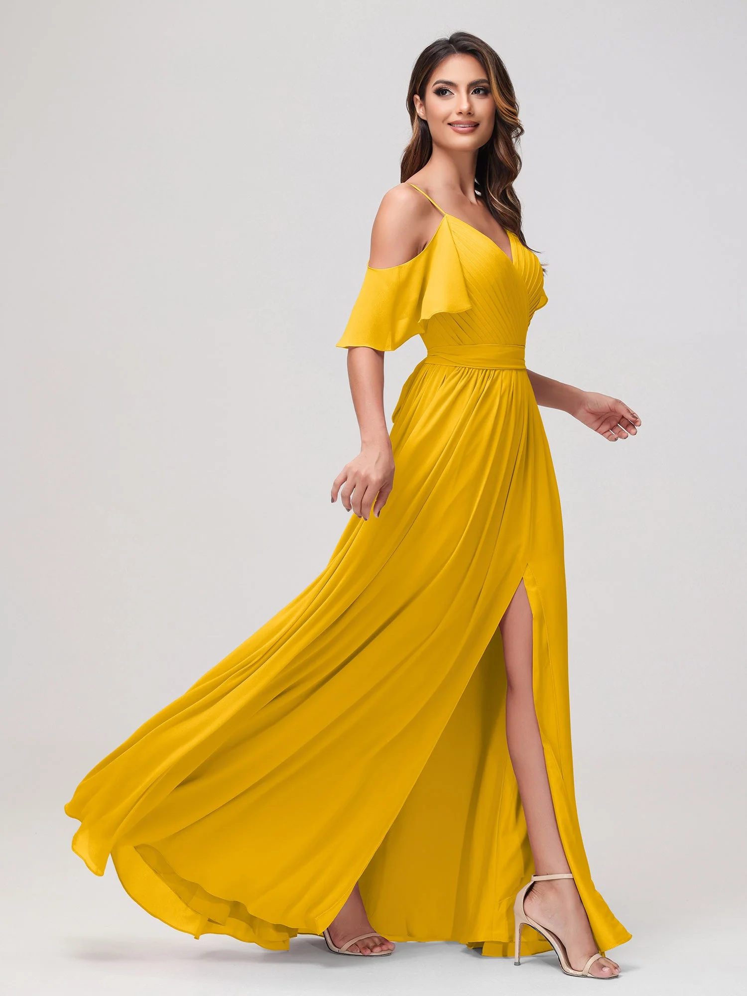 Schulterfrei A-Linie Rüschen Chiffon Kleid mit Schlitz Ringelblume