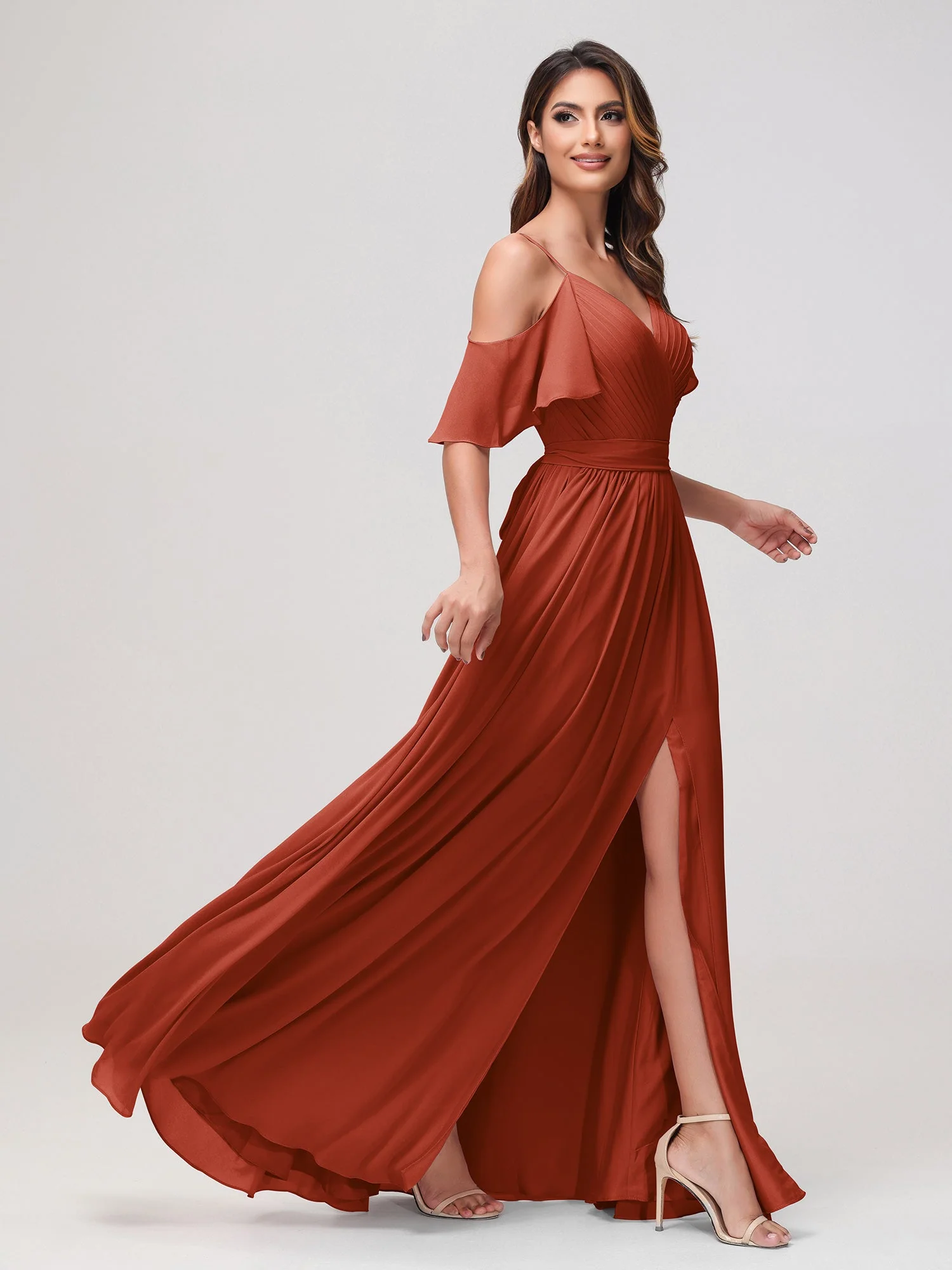 Schulterfrei A-Linie Rüschen Chiffon Kleid mit Schlitz Rost