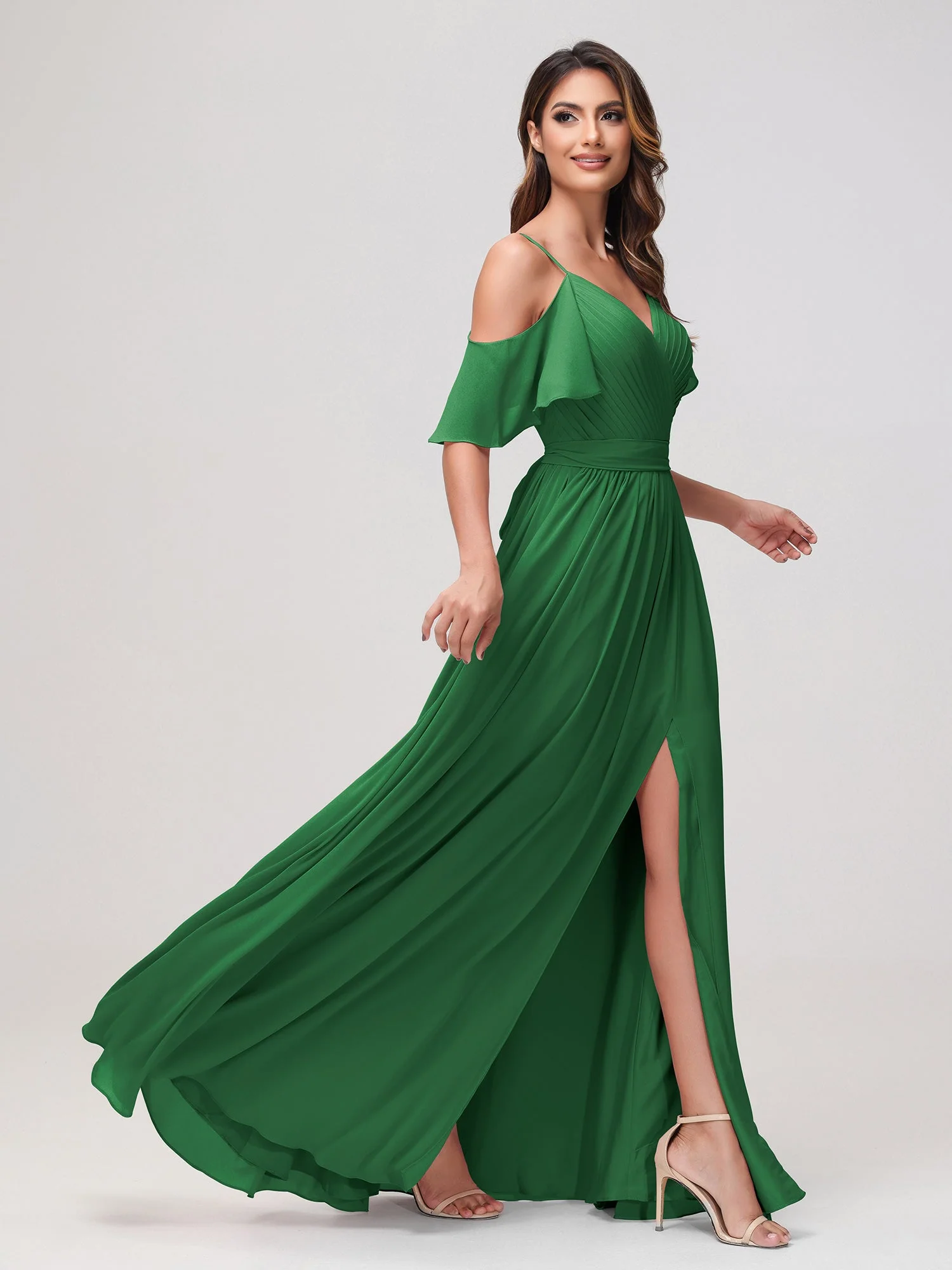 -70%Schulterfrei A-Linie Rüschen Chiffon Kleid mit Schlitz Smaragd—