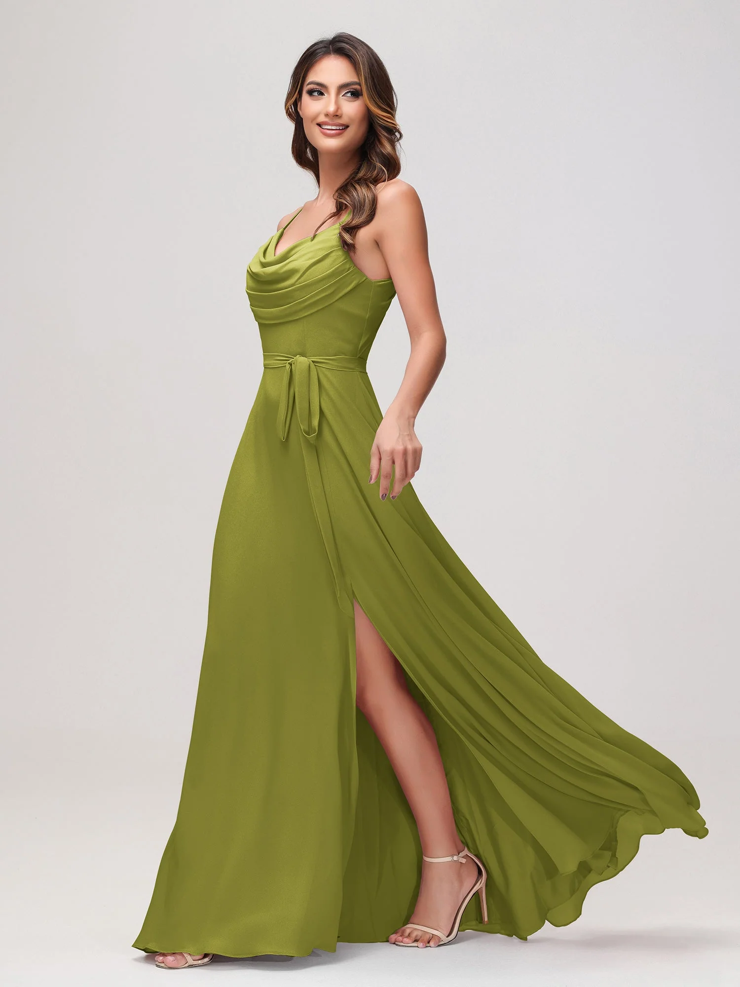 Sexy Rundhalsausschnitt Rüschen Chiffon Lang Kleid mit Schlitz Kleegrün