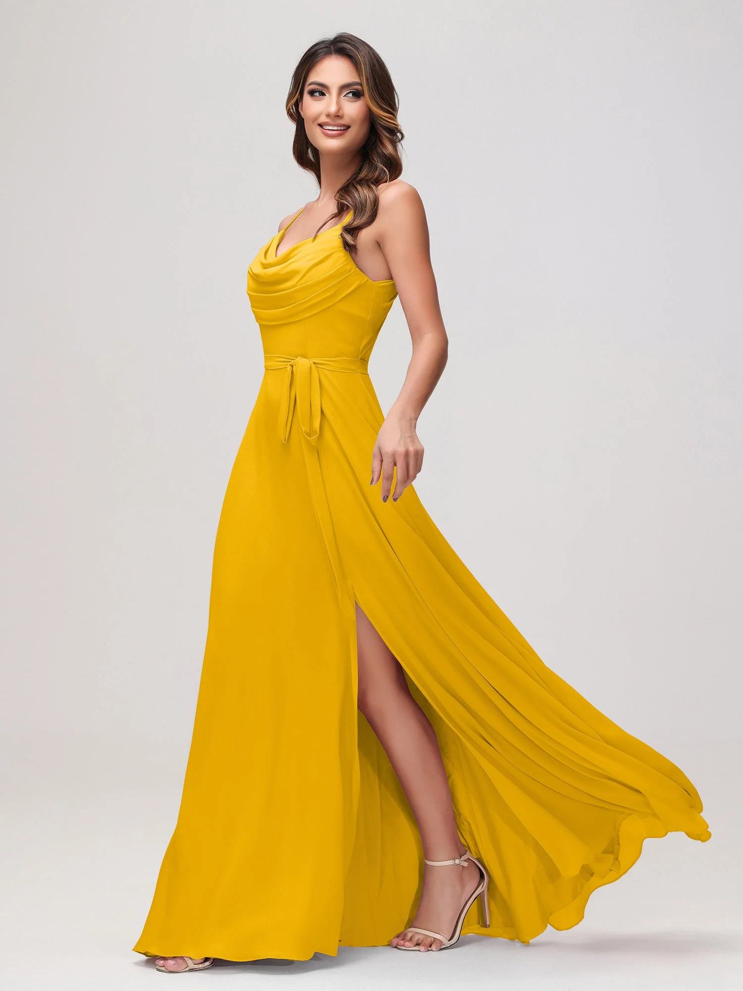 Sexy Rundhalsausschnitt Rüschen Chiffon Lang Kleid mit Schlitz Ringelblume