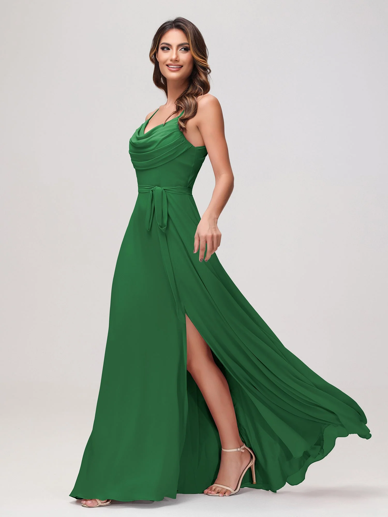Sexy Rundhalsausschnitt Rüschen Chiffon Lang Kleid mit Schlitz Smaragd