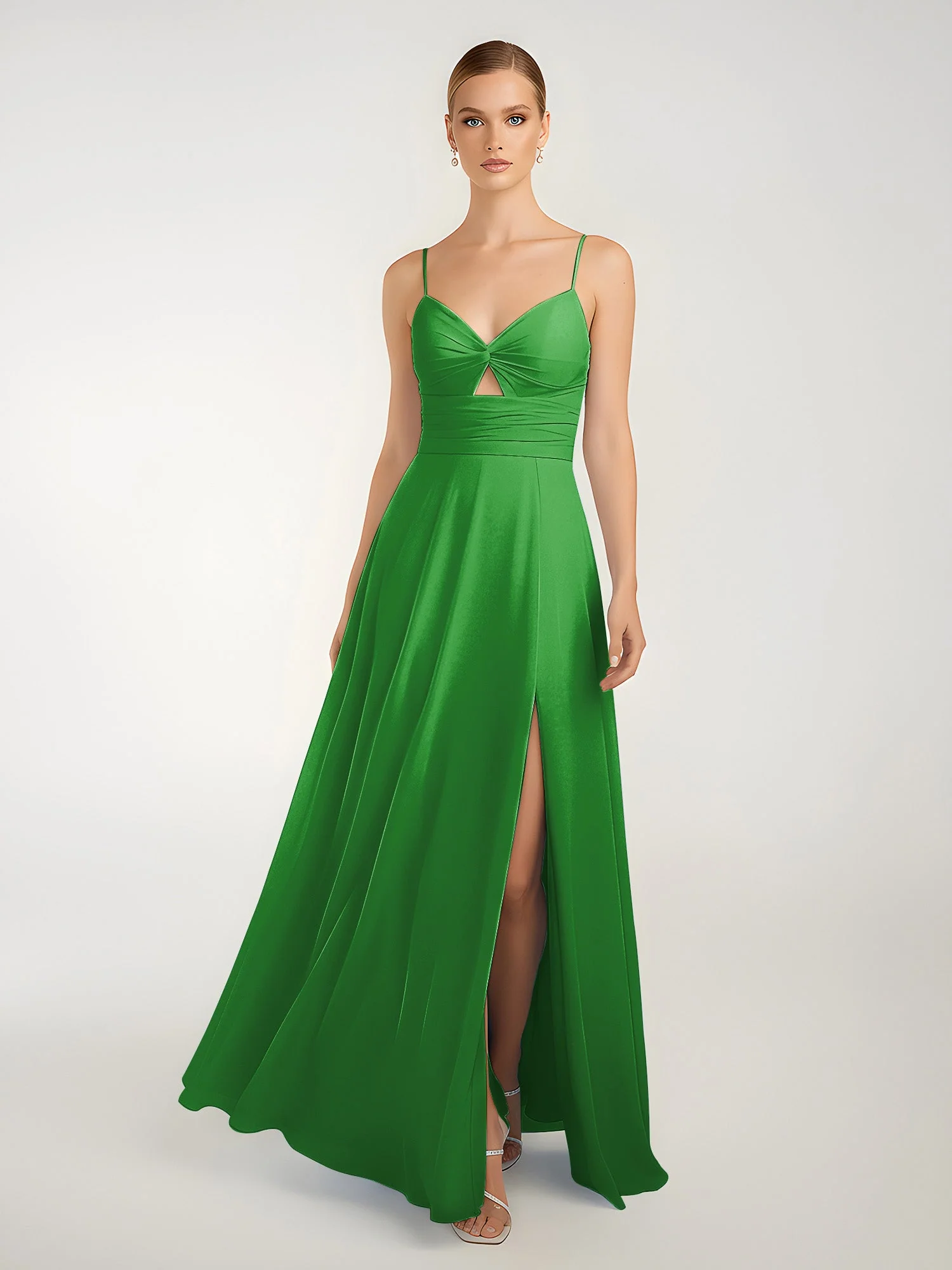 - Dieses Spaghettiträger-Kleid verfügt über einen V-Ausschnitt mit einem verdrehten Ausschnitt, gepaart mit einem fließenden bodenlängen Rock und einem hohen Schlitz. Der leichte Stoff schafft weiche Bewegung, während der Kreuzrücken eleganten Reiz verleiht - ideal für formelle Anlässe.